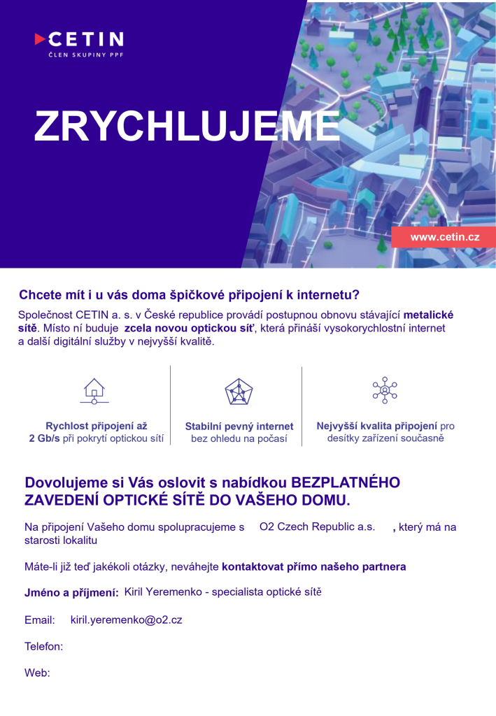 Vážení občané, zastupitelstvo schválilo projekt modernizace metalické sítě na optickou, který je investicí společnosti Cetin obci. V souvislosti s projektem najdete ve vašich schránkách dopis s detailními informacemi. V následujících dnech budete kontaktováni pracovníky partnera Cetinu. inf. NÍŽE